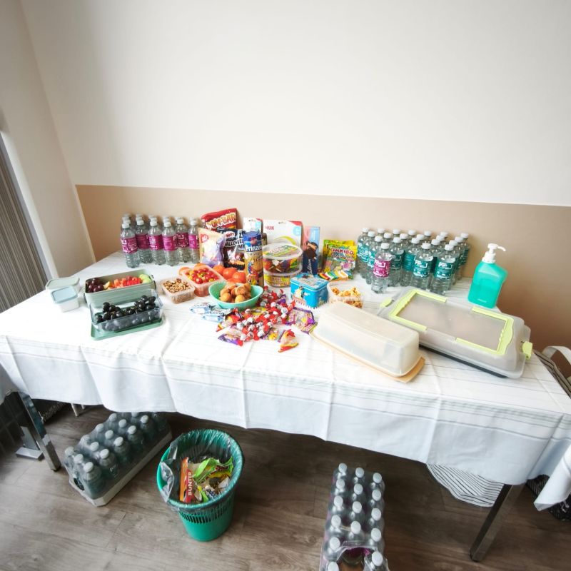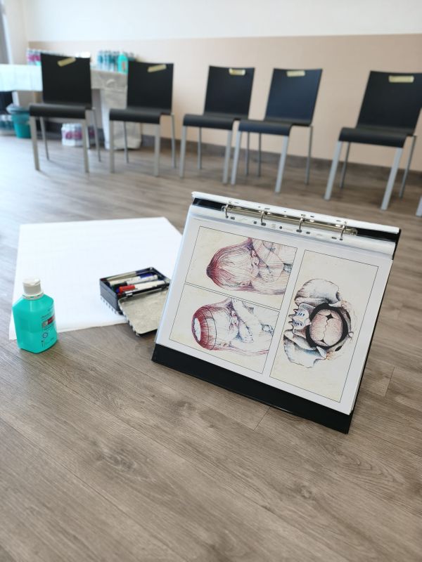 Hier findet ihr einige Kurseinblicke: den Kursraum, Materialien, mit denen wir arbeiten, und einen kleinen Tisch mit Snacks und Getränken, der die Pausen besonders gemütlich macht. So könnt ihr euch schon ein Bild von der freundlichen und entspannten Atmosphäre unseres Kurses machen.
